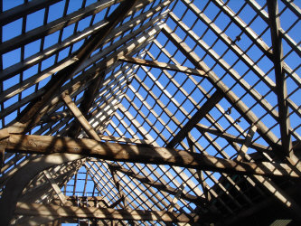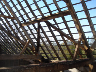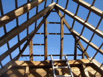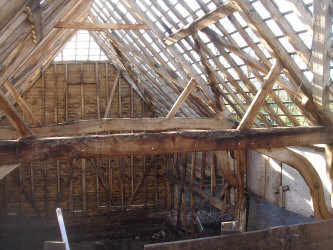 An attractive and unusual queen strut and collar three bay roof construction which features large wind braces. The wall posts are heavily jowelled and there are pleasingly curved arch braces. The roof structure is in excellent condition but some repairs and replacements are required to the wall structure. The lean-to is a later addition constructed in pine.