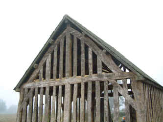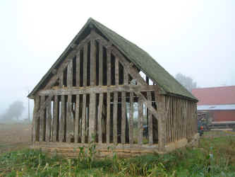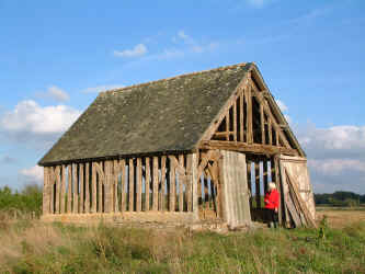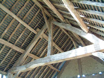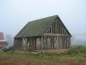 Comments: Two-bay barn originally used as a wagon shed. It has a cruck-based roof structure with double purlins. The heavy oak timbering is in superb condition.