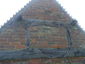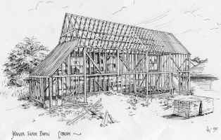 Comments: Three bay, king post roof structure, heavily timbered, in