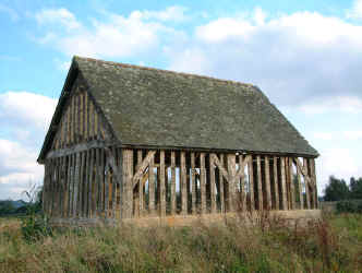 cruck-braced roof structure with double purlins. The heavy oak timbering is