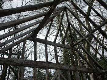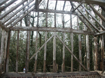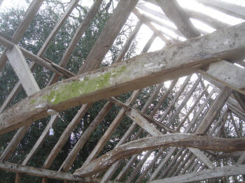 Four-bay queen strut side purlin roof with much character.